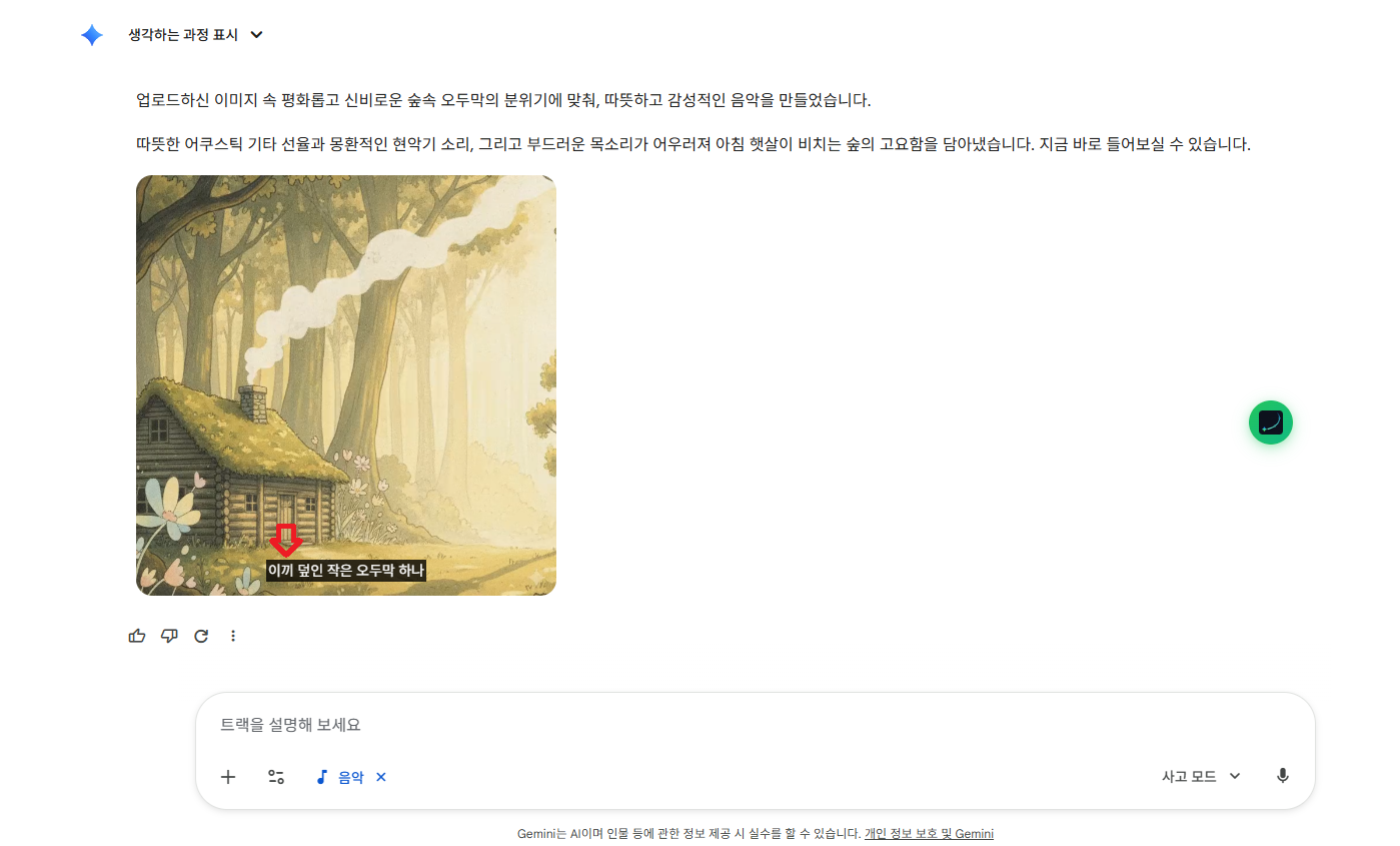 가장 놀라운 점은 제미나이가 이미지의 시각적 분위기를 분석한다는 것입니다. 예를 들어, 노을 지는 바다 사진을 올리고 "이 이미지에 어울리는 음악 만들어줘"라고 요청해 보세요.